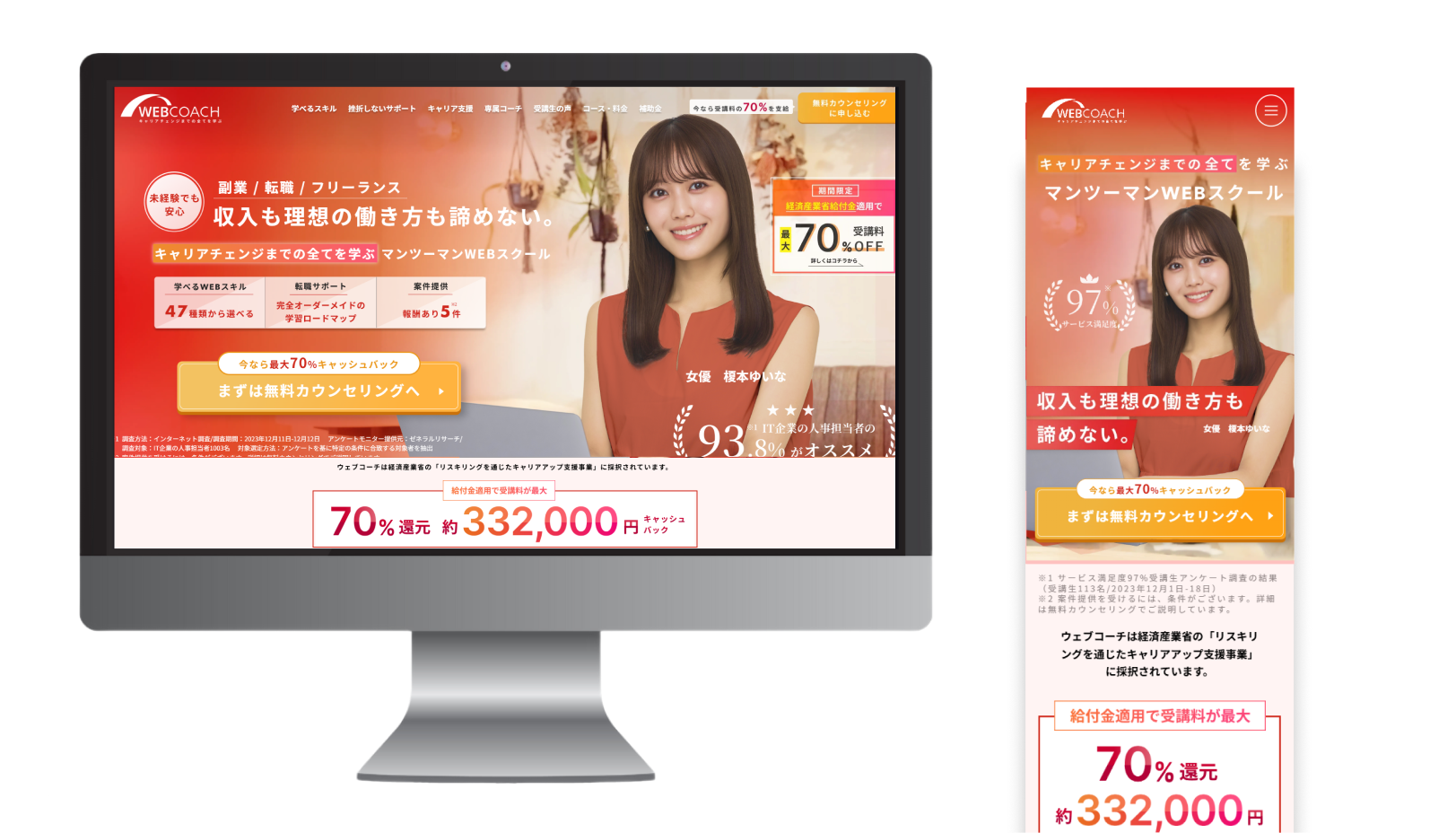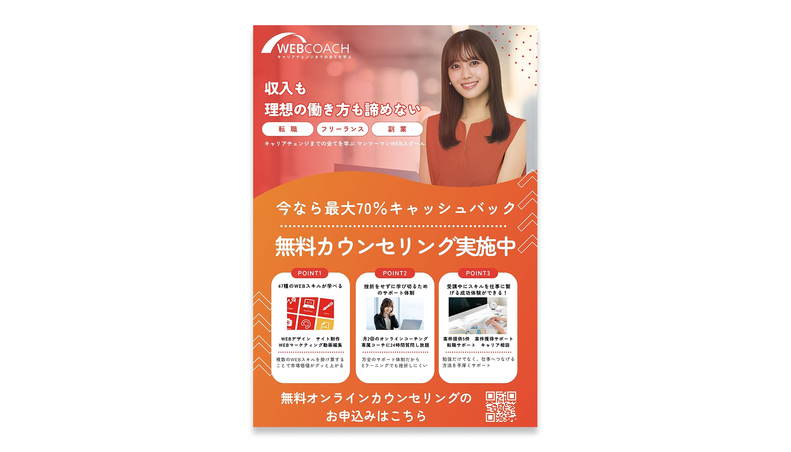 WEBCOACHは、キャリアチェンジまでの全てを学び理想の“収入と働き方”、どちらも叶えるためのマンツーマンWEBスクールです。
